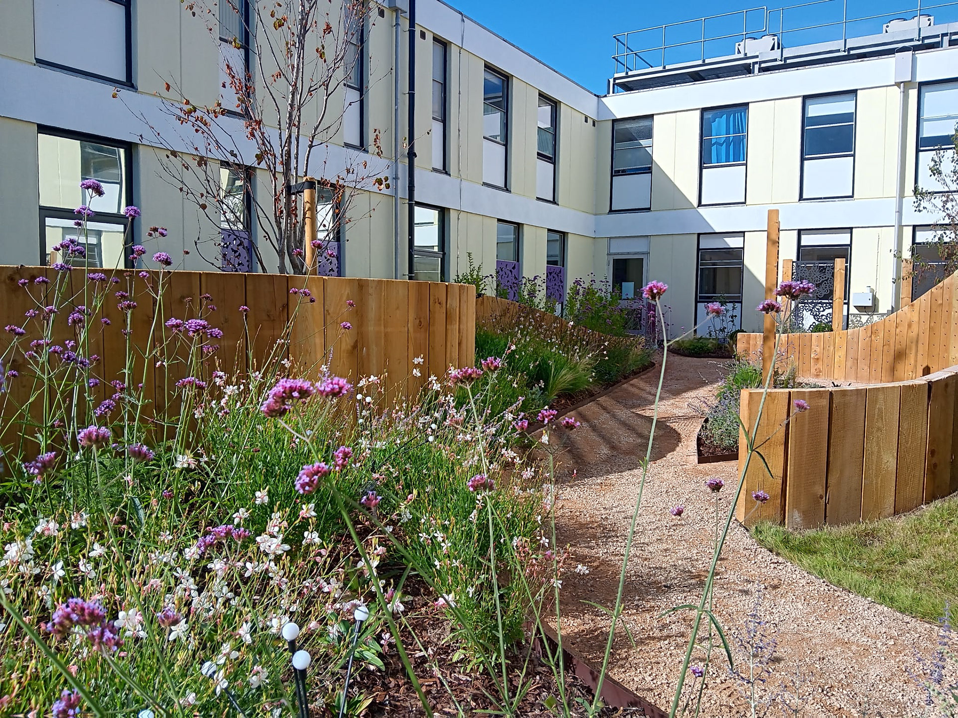 The planting scheme was intentionally centred around purple tones, as purple is the recognised colour of baby loss awareness. Species such as verbena and other purple flowering plants were selected not only to reflect this symbolic colour but also to attract butterflies, reinforcing the garden’s core motif.